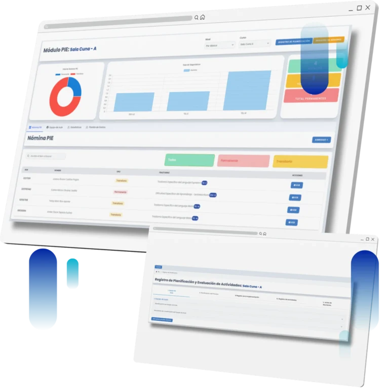Herramienta clave para el control del PIE, donde docentes y especialistas registran información académica, social y emocional de estudiantes con NEE. Permite gestionar PAI, PACI, PAEC, Bitácora DEC y documentación exigida por el MINEDUC, facilitando la labor de coordinación.